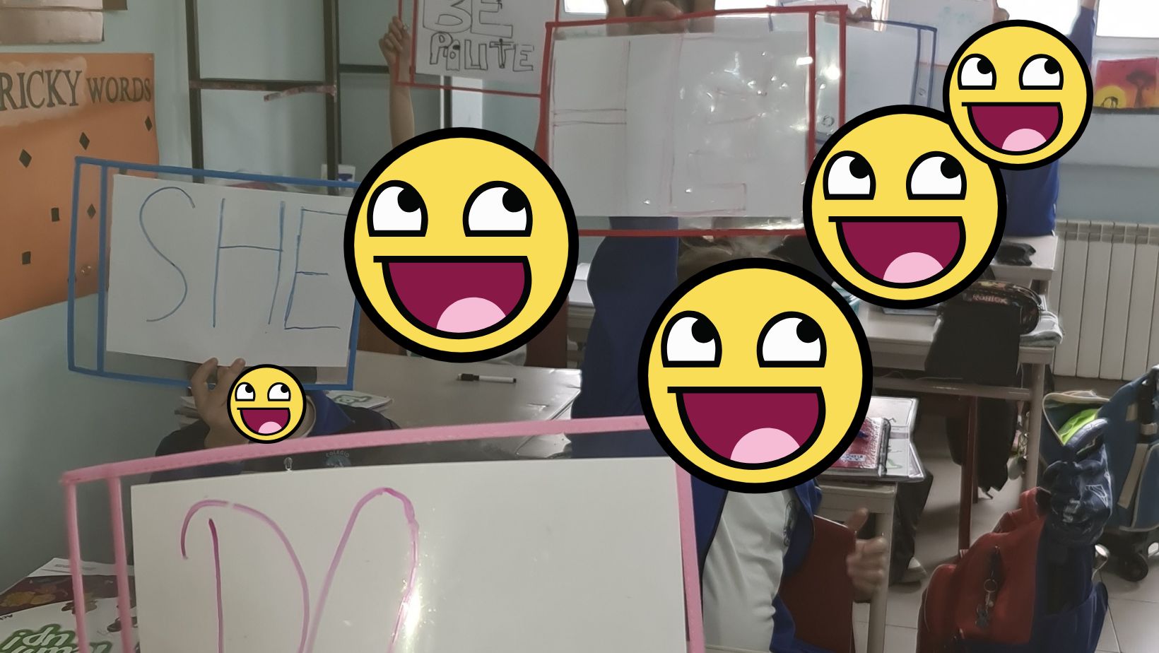 Además de las palabras que se llevan mal, tenemos otras que se necesitan mutuamente. Son Do y Does con el signo de interrogación. De esta manera, el niño que tiene el signo de interrogación en la pizarra sabe que necesita a su media naranja. Si el alumno que forma la frase pone el signo de interrogación pero se olvida de Do o Does, nuestro signo de interrogación llora. El resto de alumnos avisan de que el signo de interrogación está llorando y rápidamente se dan cuenta de que falta por poner en la oración Do o Does, según el sujeto que hayan elegido.